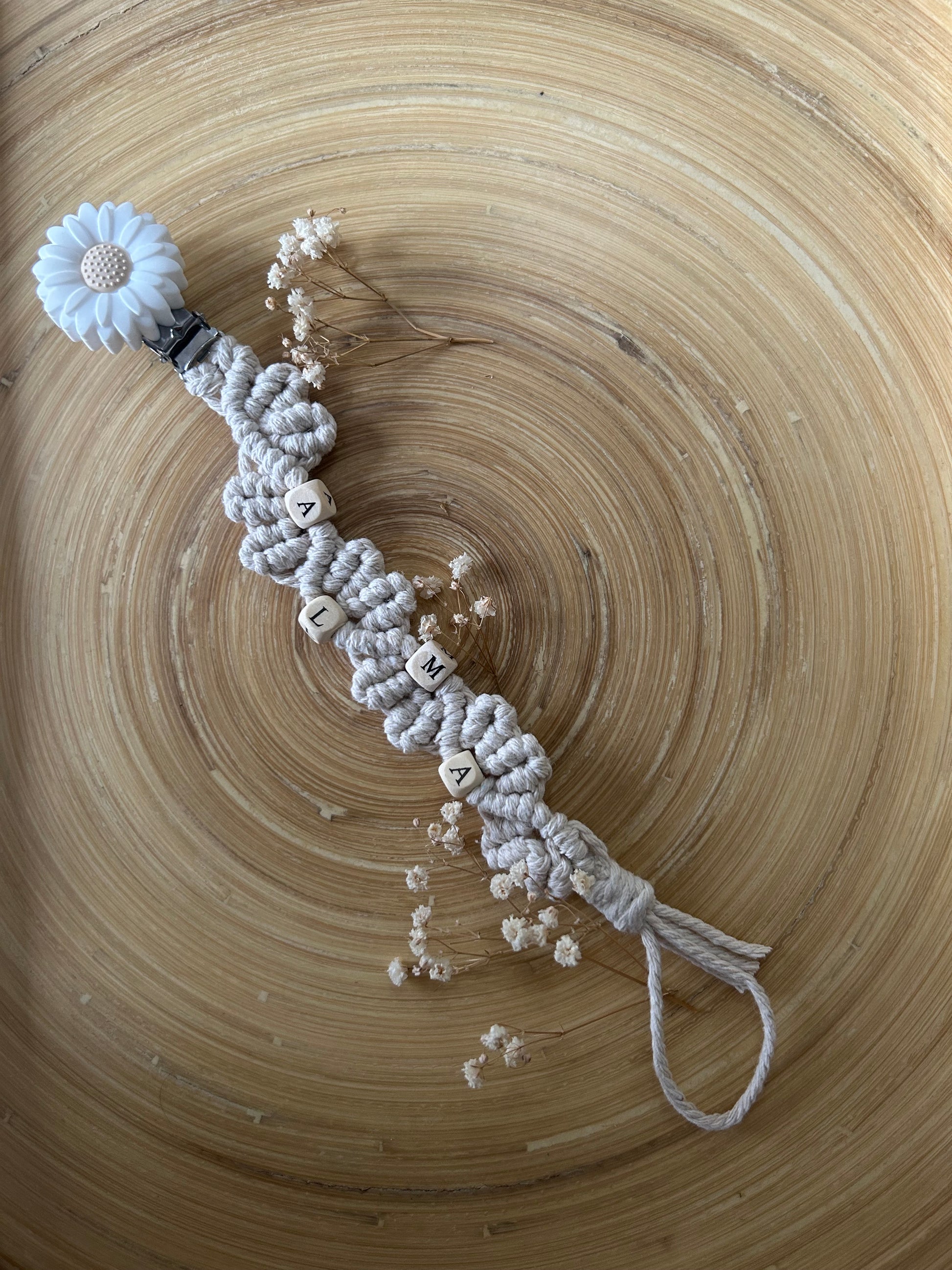 Attache Tétine Macramé Personnalisée - Coton bio OEKO-TEX, Perles bois naturel et Pince Silicone sans BPA